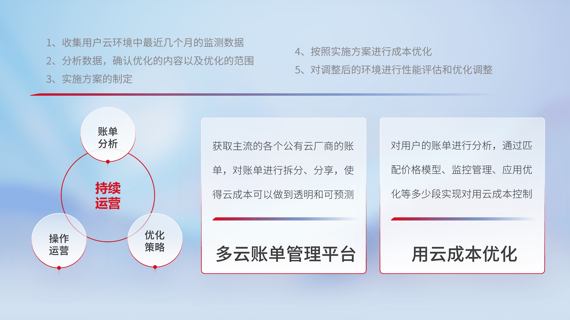 通过多云纳管,,,,以统一的资源数据模型把客户的云资源进行抽象和封装,,,进而实现对多云资源的统一操作,,,,保障云资源管理的可靠性、、、、稳定性与可用性。。。。量身定制化运维内容,,,配置、、开发运维、、、补丁管理、、、、备份、、监控、、、认证和访问管理、、、审计和日常巡检等,,保障在用云过程中的可靠度,,稳定度以及高可用率。。。。