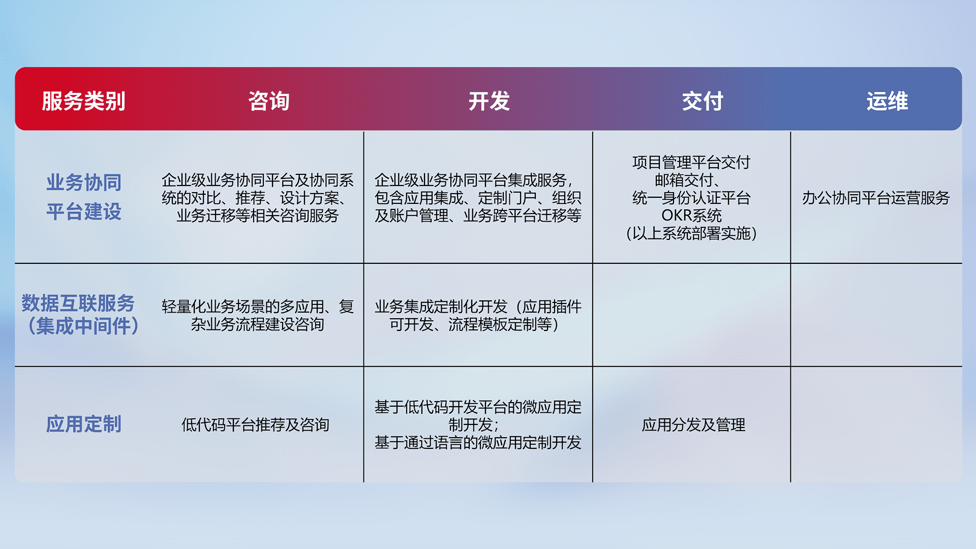 针对钉钉、、、企微、、IDaas等平台级产品提供产品的规划、、、、方案、、、交付、、、定制化开发等服务,,,,实现如统一协同办公、、、智能客户服务、、、、混合会议管理、、智能数据查询、、等业务场景,,,,实现数字化转型。。